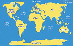 Amerika utara, amerika selatan, eropah, afrika, asia, australia, antartika, lautan pasifik, lautan atlantik, lautan selatan, lautan artik, selat melaka.